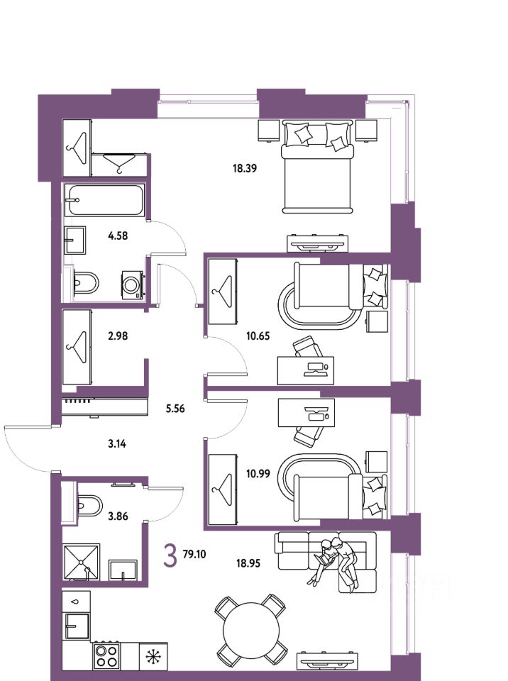 Продаётся 3-комнатная квартира в строящемся доме (Дом 2), срок сдачи: IV-кв. 2027, общей площадью 79.1 кв.м., на 2 этаже. "Страна. Тополёвая" - органично вписанный в городскую среду дом-квартал переменной этажности с акцентной башней доминантой. Мы открываем новую главу истории города, создавая пространство, в котором комфортно жить, работать и строить счастливое будущее.