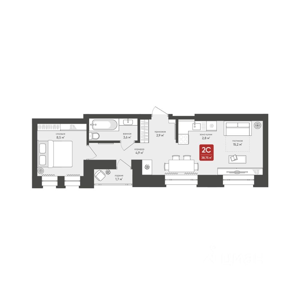Продаётся 2-комнатная квартира в строящемся доме (Дом 1), срок сдачи: I-кв. 2026, общей площадью 38.75 кв.м., на 16 этаже.