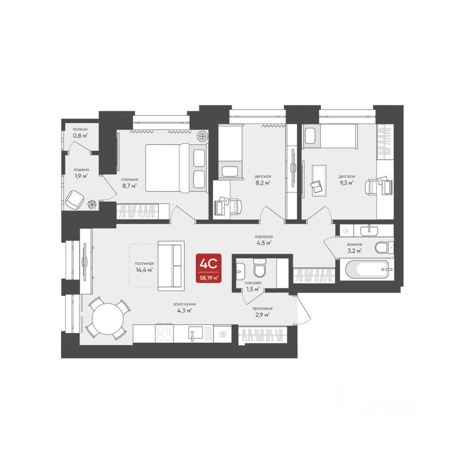 Продаётся 4-комнатная квартира в строящемся доме (Дом 1), срок сдачи: I-кв. 2026, общей площадью 58.19 кв.м., на 17 этаже.