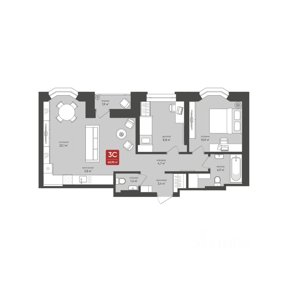 Продаётся 3-комнатная квартира в строящемся доме (Дом 1), срок сдачи: I-кв. 2026, общей площадью 60.95 кв.м., на 17 этаже.