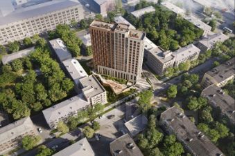 Этажность дома и стиль фасада выделяют здание среди окружающей застройки. Кирпич разных оттенков, ночная подсветка, правильная геометрическая форма - архитектуру можно рассматривать и любоваться каждой деталью.