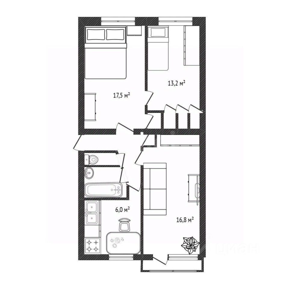 Жилая площадь — 47,5 кв. м, включает одну изолированную комнату и две смежные, кухня — 6,2 кв. м, санузел — раздельный, благоустроенный, в хорошем состоянии, окна выходят на обе стороны дома