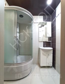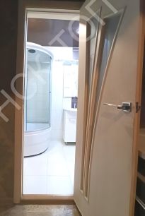 -ванная комната 2,8 кв.м, облицована кафелем, с душевой кабиной и раковиной с напольной тумбой и зеркалом;