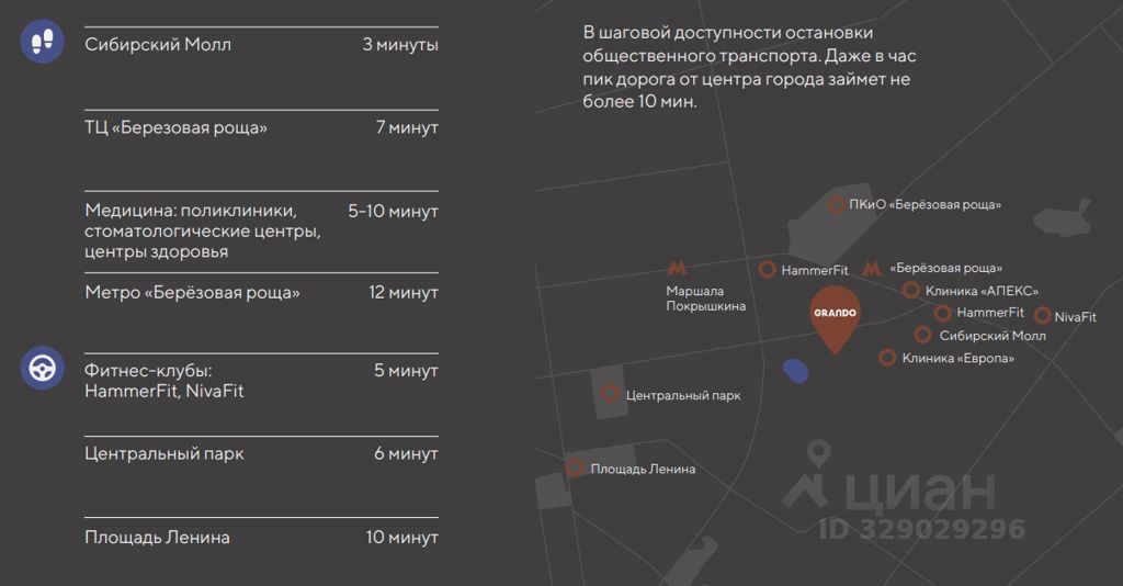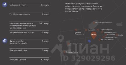 +Развитая ифраструктура: транспорт (автобусы, троллейбусы, метро "Березовая роща"), социальная (школы, детсады, поликлиники), торговая ("Сибирский молл", магазины всех известных продуктовых ритейлеров в пешей доступности), культурная (парк "Березовая роща")