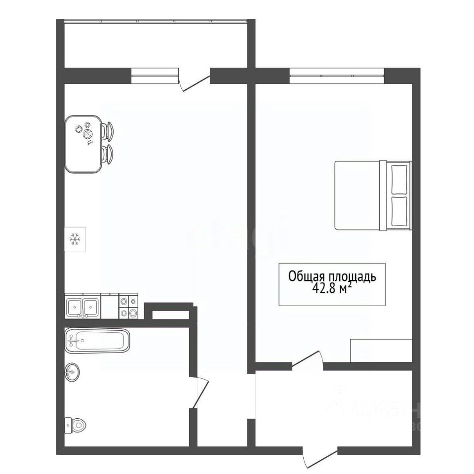 - Общая площадь 42,8 кв.м.