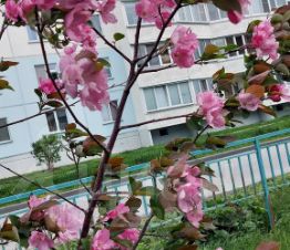 Вид из окон на живописную яблоневую аллею, перед окнами красивая сирень.