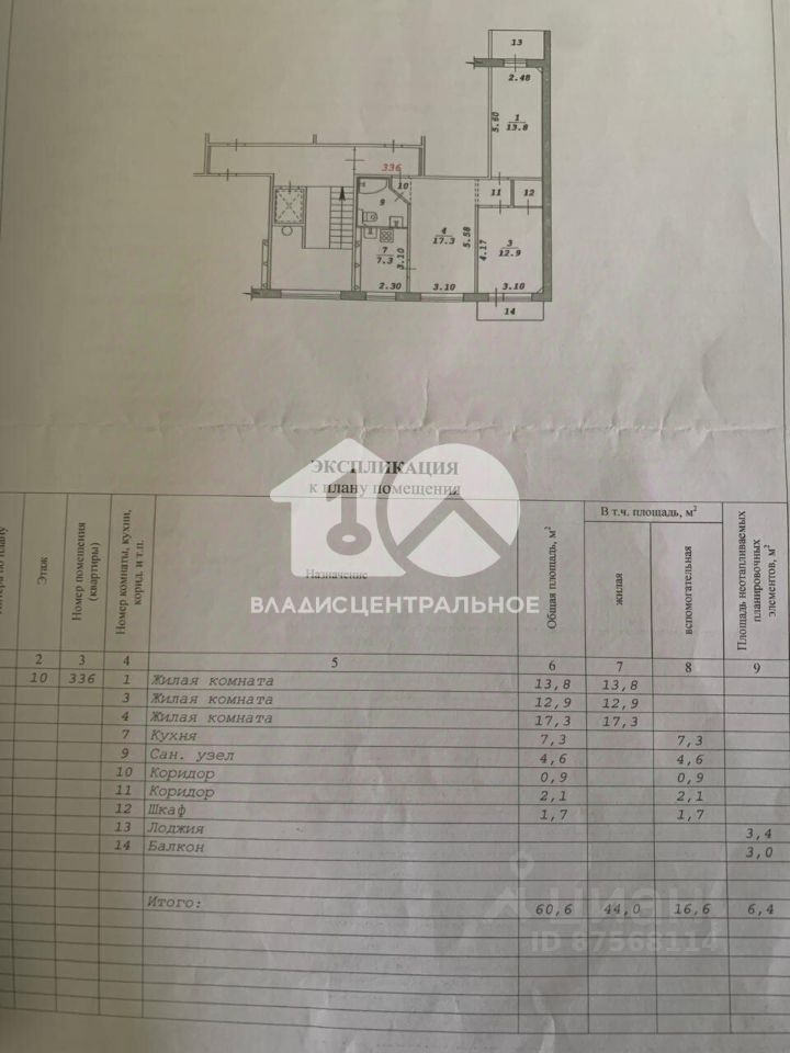 Площадь: Общая — 60,6 м², Жилая — 44 м², Кухня — 7 м².
