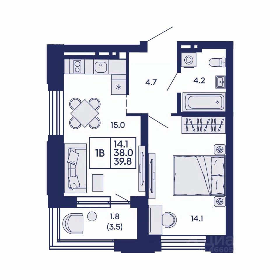 Продаётся 1-комнатная квартира в сданном доме (Дом 1), срок сдачи: IV-кв. 2025, общей площадью 39.8 кв.м., на 2 этаже. Жилой квартал "Сподвижники" от компании Vira.