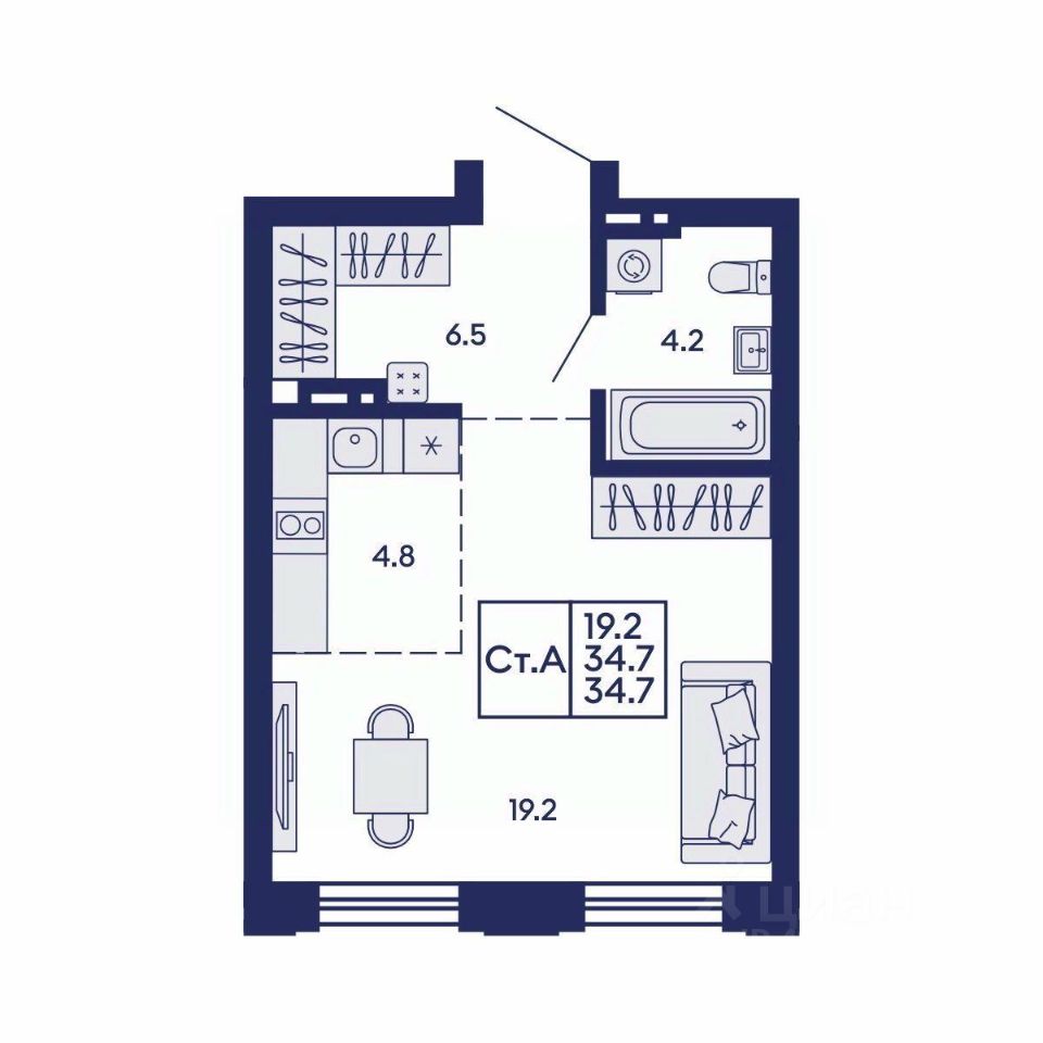 Продаётся 1-комнатная квартира в сданном доме (Дом 1), срок сдачи: IV-кв. 2025, общей площадью 34.7 кв.м., на 3 этаже. Жилой квартал "Сподвижники" от компании Vira.