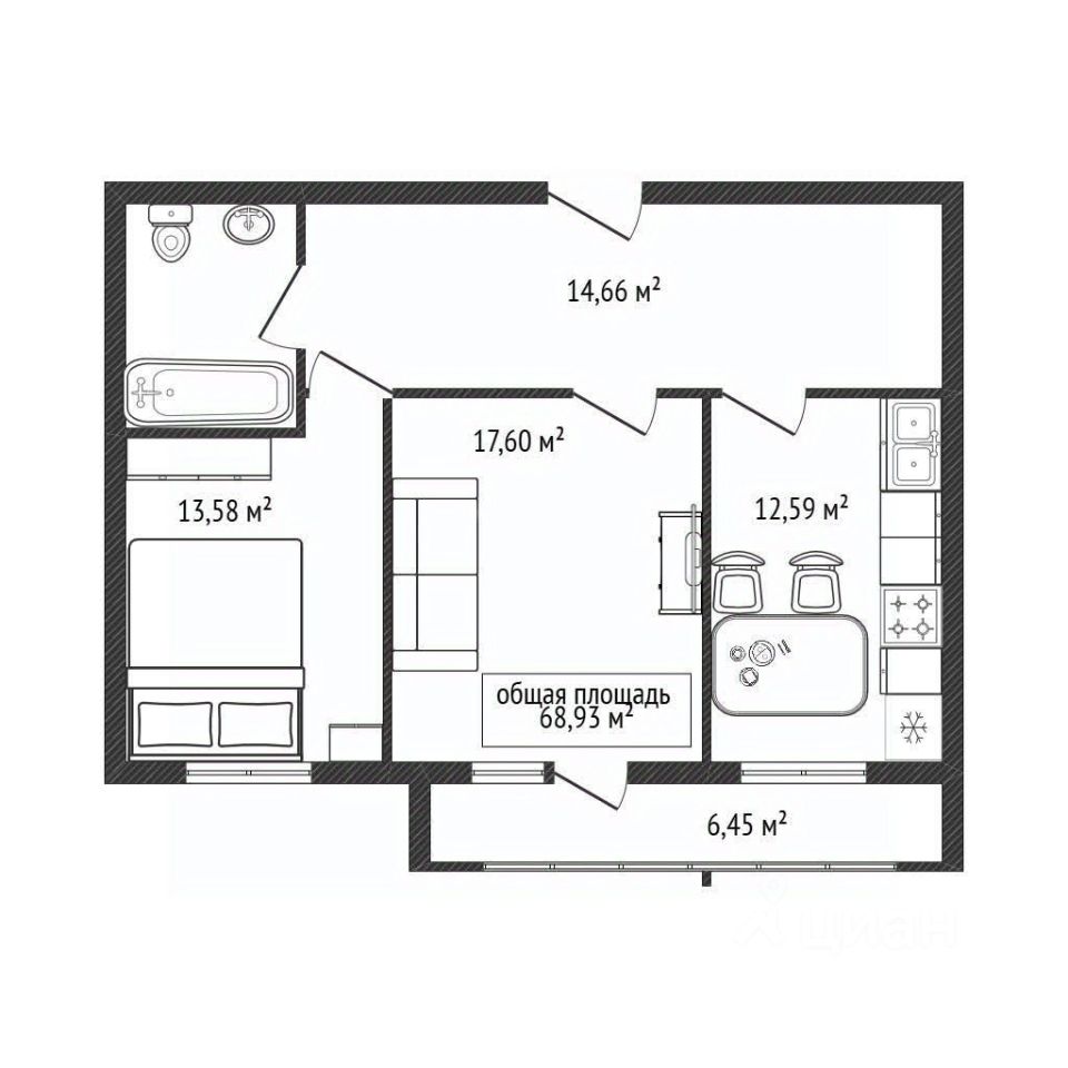 2-комнатная квартира (2К) с общей площадью 68,93 м².