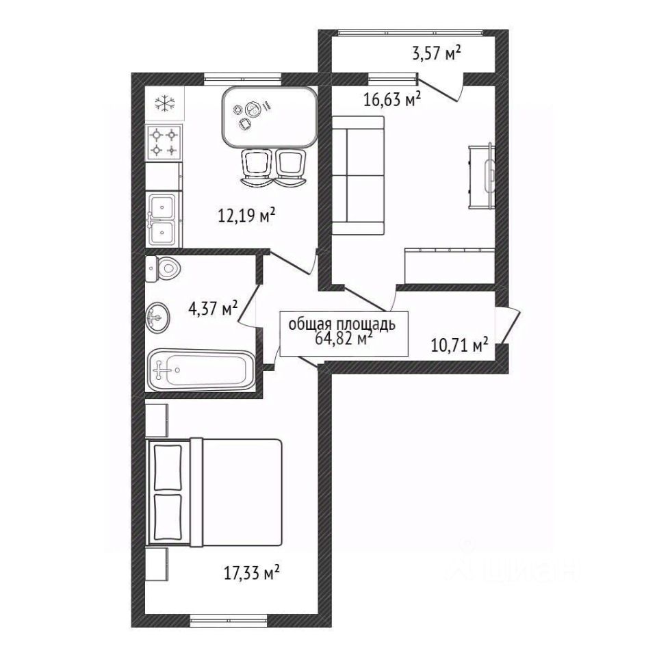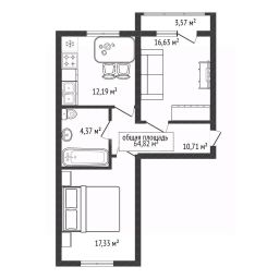 2-комнатная квартира (2К) с общей площадью 61,8 м².