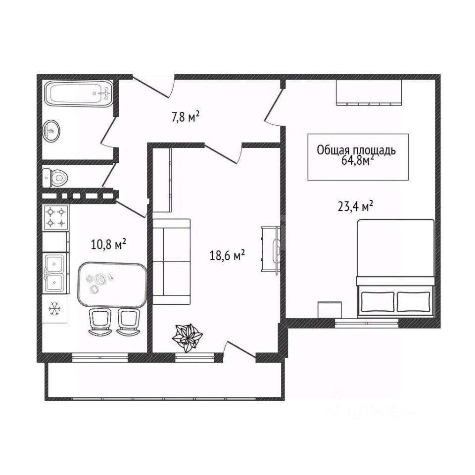 - Общая площадь - 64,8 кв.м + лоджия 7 кв.м
