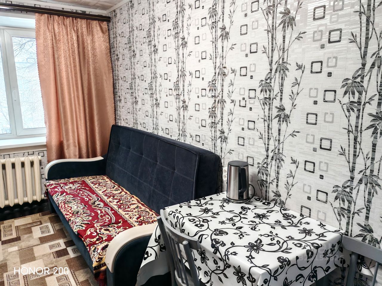 При входе в комнату есть место для приготовления пищи: стол, навесной шкафчик, 2-хкомфорочнаяэлектроплита с духовкой и холодильник. В комнате остается шкаф, диван и стол. Так же есть встроенный шкаф в коридоре.