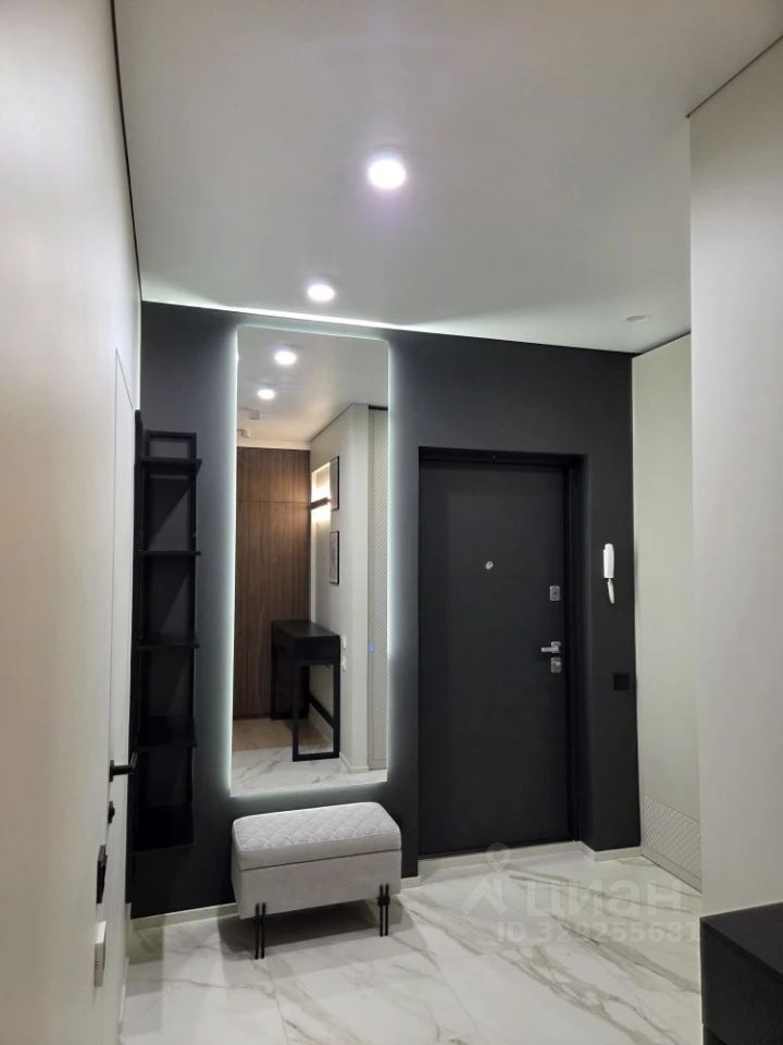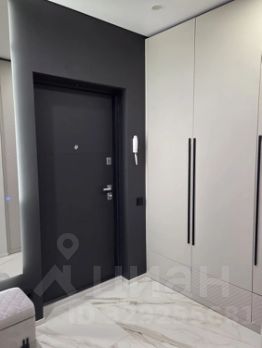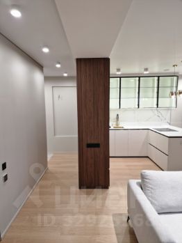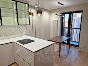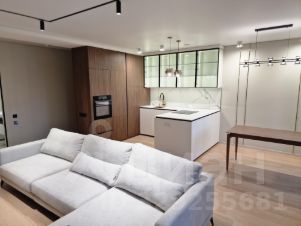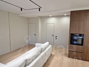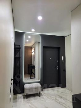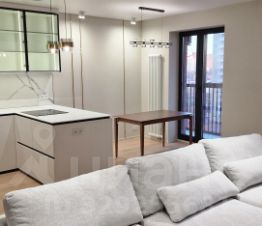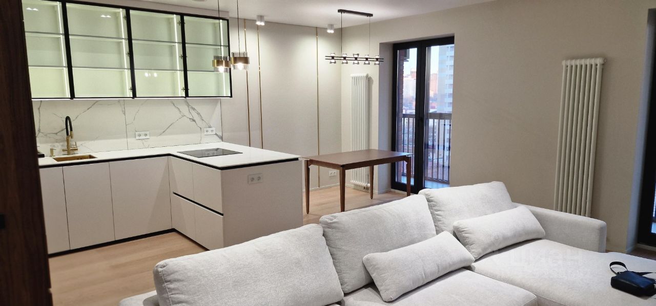 Кухня объединена с гостиной в одно просторное помещение с панорамными окнами в пол. В этой зоне установлен кондиционер (работает на охлаждение и обогрев, возможно удалённое подключение и упраление через смартфон), а также встроенная бытовая техника: духовка, варочная панель, посудомоечная машина, холодильник, водонагреватель, колонна стиральной и сушильной машины расположены в коридоре в шкафу.