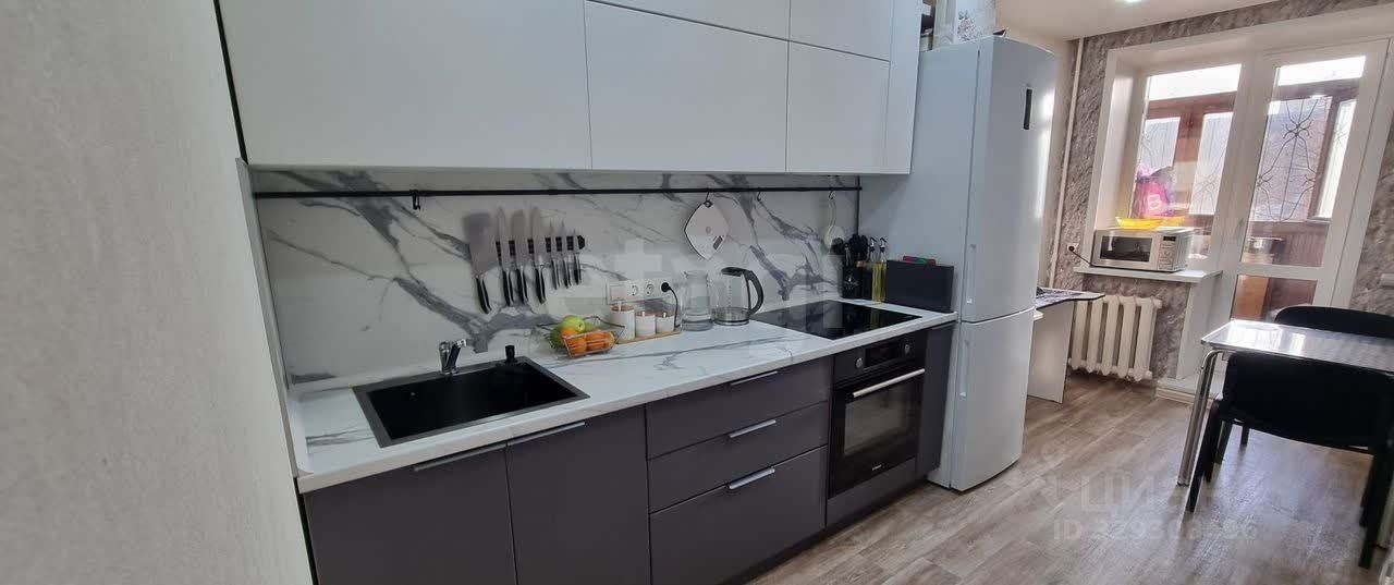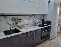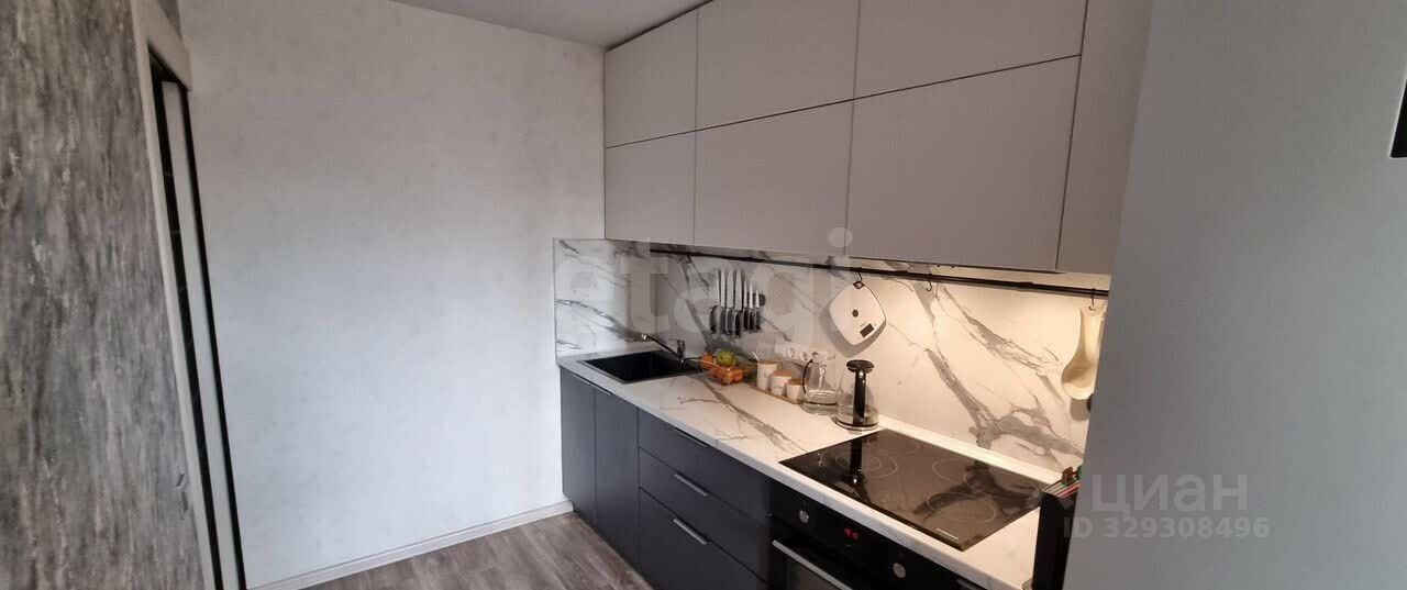 Кухня оборудована стильной мебелью и техникой: варочная панель, духовой шкаф. В совмещённой ванной установлена качественная сантехника, стиральная машина и водонагреватель. Из техники в квартире также есть кондиционер. Остаётся шкаф, кровать и диван.