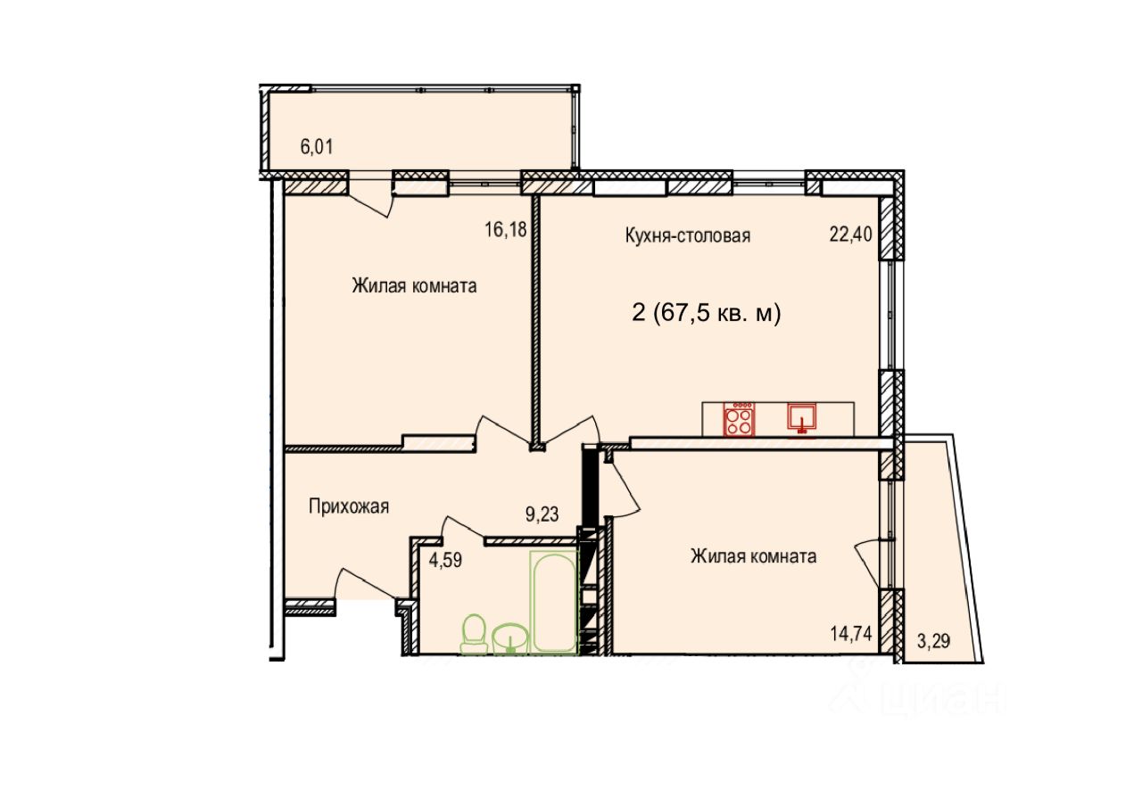 Продаётся 2-комнатная квартира в сданном доме (Пригородная, 30), срок сдачи: I-кв. 2024, общей площадью 67.5 кв.м., на 15 этаже.