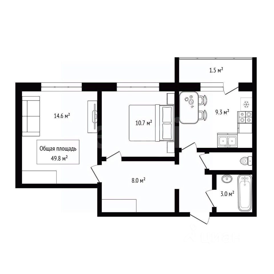 Удобная планировка квартиры: две спальни, кухня-гостинная, раздельный санузел, просторная ванная комната.