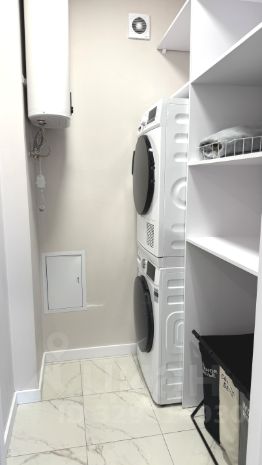 Эргономичной эту планировку делает и то, что рядом с входной дверью есть скрытая дверями-купе ниша под гардероб. И ещё есть одно подсобное помещение, рядом с санузлом, в котором компактно разместилась стиральная машина, сушилка и кладовая.