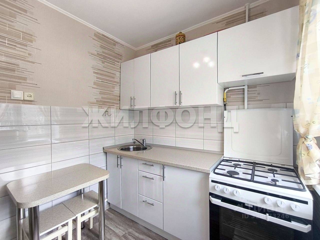 Остается мебель/техника: встроенный кухонный гарнитур и газовая плита.