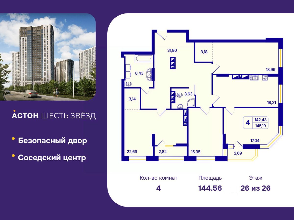 4-комн. квартира с предчистовой отделкой в ЖК "Астон. Шесть Звезд" на 26 этаже. Общая площадь: 144.56 кв.м., жилая: 74.04 кв.м., площадь просторной кухни-столовой: 18.21 кв.м. Квартира угловая, идеально подойдет любителям тишины и панорамных видов. В квартире одна лоджия, два совмещенных санузла. Высота потолков 2.68 м.