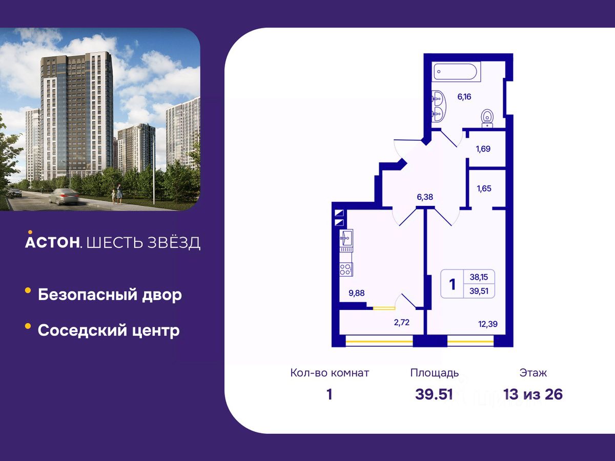 Просторная 1-комн. квартира с предчистовой отделкой в ЖК "Астон. Шесть Звезд" на 13 этаже. Общая площадь: 39.51 кв.м., жилая: 12.39 кв.м., площадь просторной кухни-столовой: 9.88 кв.м. Все окна выходят на одну сторону. В квартире одна лоджия, один совмещенный санузел. Высота потолков 2.65 м.