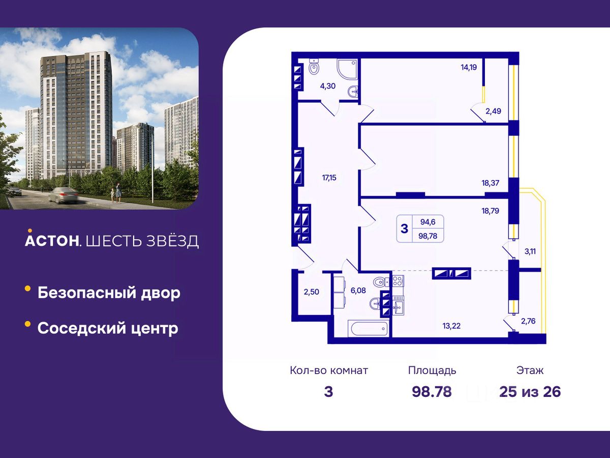 Трехкомнатная квартира с европланировкой и предчистовой отделкой в ЖК "Астон. Шесть Звезд" на 25 этаже. Общая площадь: 98.78 кв.м., жилая: 51.35 кв.м., общая площадь гостиной-столовой с кухонной зоной: 32.01 кв.м. Европейская планировка, кухня-гостиная - идеальный вариант для тех, кто любит часто принимать гостей. Комнаты изолированные, все окна выходят на одну сторону. В квартире два балкона, два совмещенных санузла. Высота потолков 2.65 м.