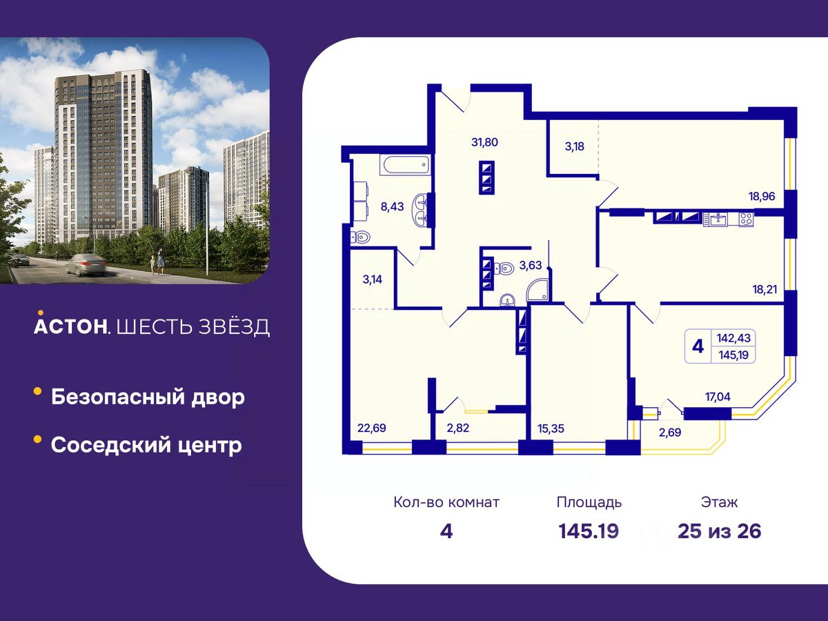 4-комн. квартира с предчистовой отделкой в ЖК "Астон. Шесть Звезд" на 25 этаже. Общая площадь: 145.19 кв.м., жилая: 74.04 кв.м., площадь просторной кухни-столовой: 18.21 кв.м. Квартира угловая, идеально подойдет любителям тишины и панорамных видов. В квартире одна лоджия, два совмещенных санузла. Высота потолков 2.65 м.