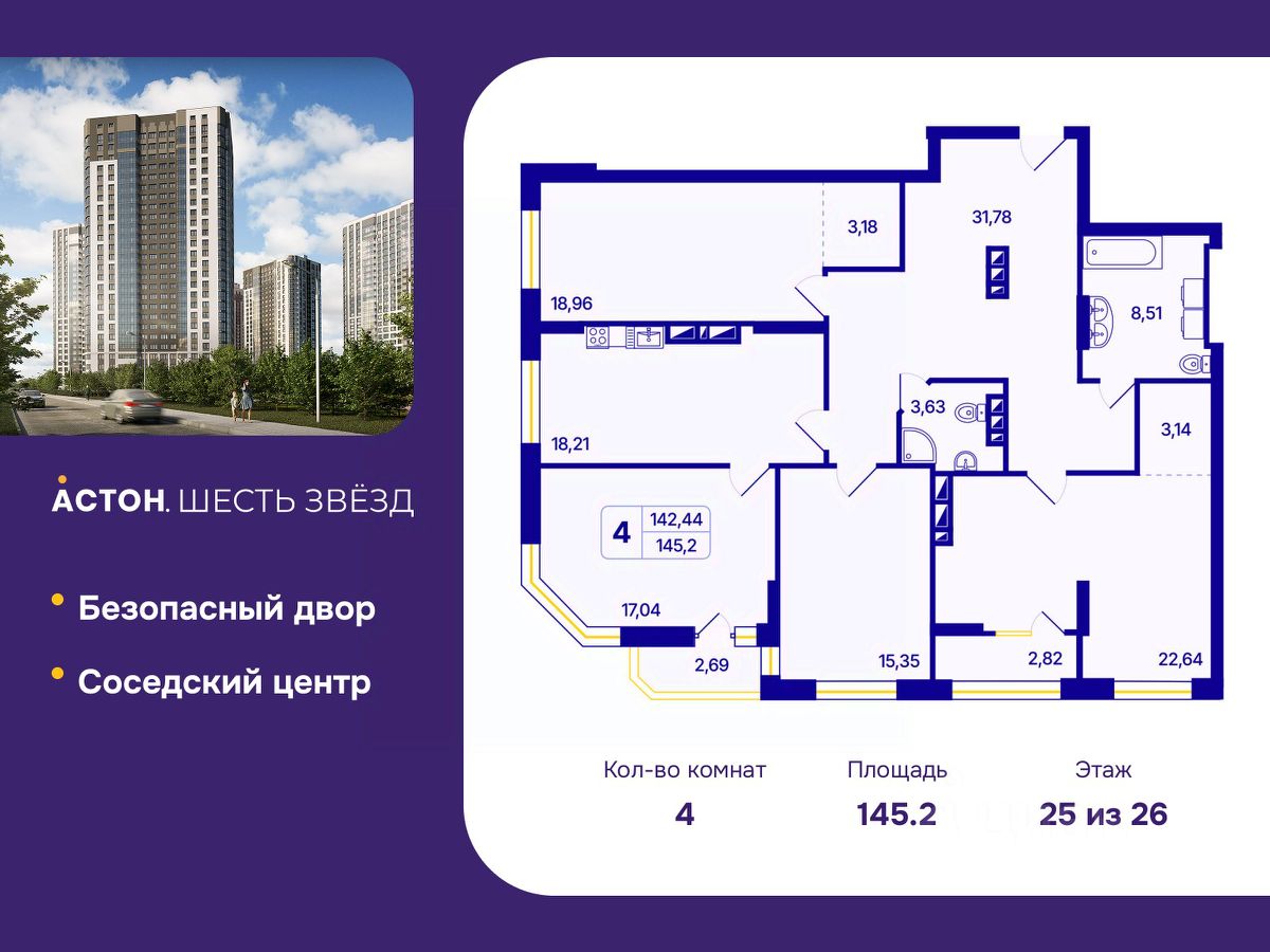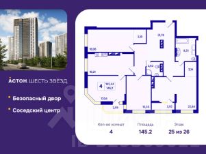 Четырехкомнатная квартира от застройщика с предчистовой отделкой в ЖК "Астон. Шесть Звезд" на 25 этаже. Общая площадь: 145.2 кв.м., жилая: 73.99 кв.м., площадь просторной кухни-столовой: 18.21 кв.м. Квартира угловая, очень светлая, естественная вентиляция при открытии окон. В квартире одна лоджия, два совмещенных санузла. Высота потолков 2.65 м.