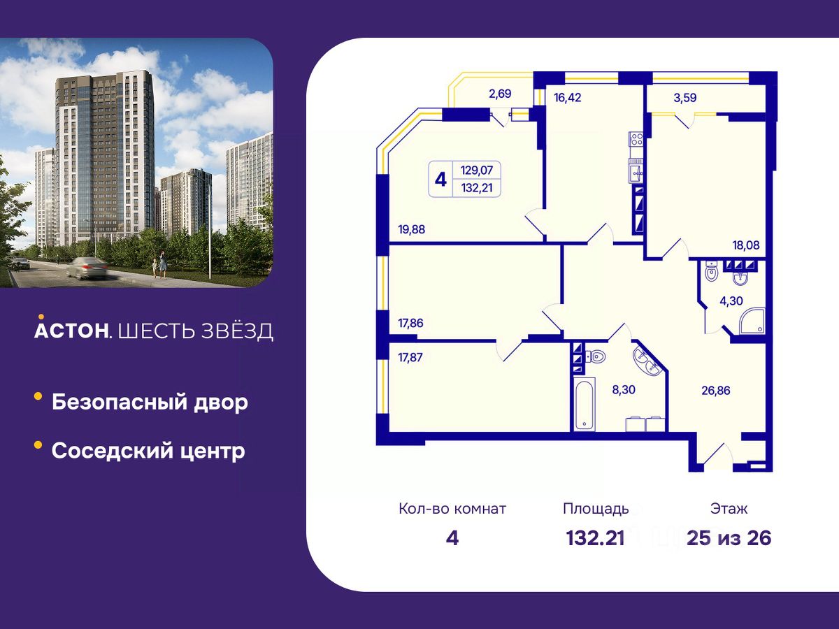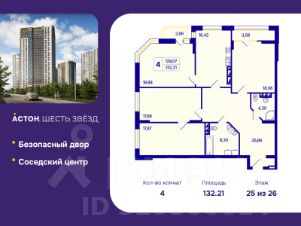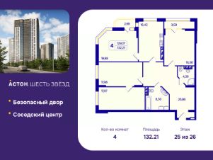 Просторная четырехкомнатная квартира с предчистовой отделкой в ЖК "Астон. Шесть Звезд" на 25 этаже. Общая площадь: 132.21 кв.м., жилая: 73.69 кв.м., площадь просторной кухни-столовой: 16.42 кв.м. Угловая квартира, очень светлая, естественная вентиляция при открытии окон. В квартире две лоджии, два совмещенных санузла. Высота потолков 2.65 м.