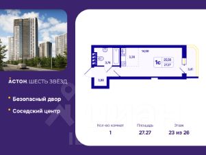 Однокомнатная квартира-студия с предчистовой отделкой в ЖК "Астон. Шесть Звезд" на 23 этаже. Общая площадь: 27.27 кв.м., площадь гостиной 17.94 кв.м., из которых 3.38 кв.м. выделено под кухонную зону. Все окна выходят на одну сторону. В квартире один балкон, один совмещенный санузел. Высота потолков 2.65 м.