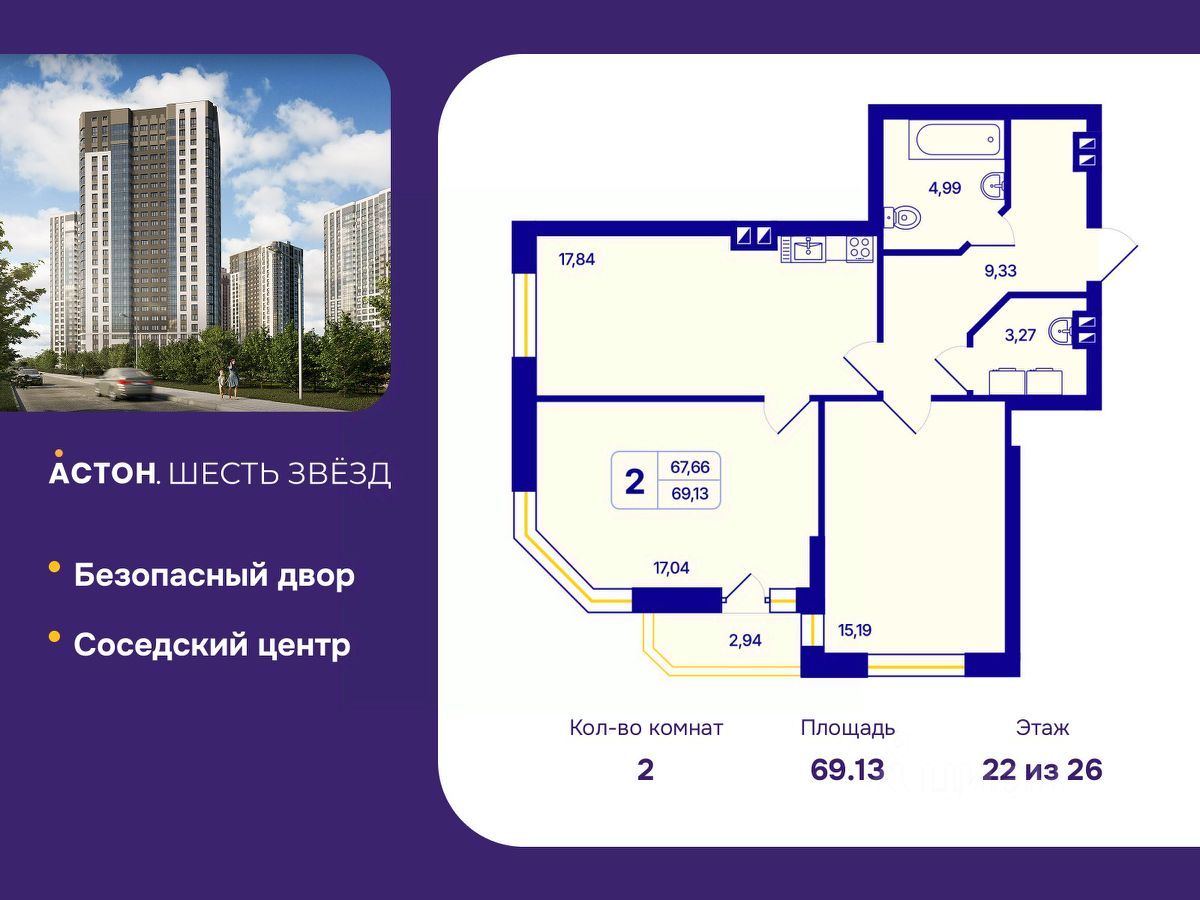 Просторная 2-комн. квартира с предчистовой отделкой в ЖК "Астон. Шесть Звезд" на 22 этаже. Общая площадь: 69.13 кв.м., жилая: 32.23 кв.м., площадь просторной кухни-столовой: 17.84 кв.м. Квартира угловая, очень светлая, естественная вентиляция при открытии окон. В квартире одна лоджия, один совмещенный и один раздельный санузел. Высота потолков 2.65 м.