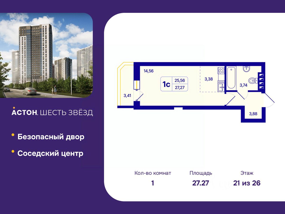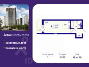 Просторная однокомнатная квартира-студия с предчистовой отделкой в ЖК "Астон. Шесть Звезд" на 21 этаже. Общая площадь: 27.27 кв.м., площадь гостиной 17.94 кв.м., из которых 3.38 кв.м. выделено под кухонную зону. Все окна выходят на одну сторону. В квартире один балкон, один совмещенный санузел. Высота потолков 2.65 м.