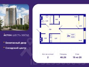 2-комн. квартира с европланировкой и предчистовой отделкой в ЖК "Астон. Шесть Звезд" на 19 этаже. Общая площадь: 46.26 кв.м., жилая: 24.96 кв.м., общая площадь гостиной-столовой с кухонной зоной: 18.0 кв.м. Европейская планировка, кухня и гостиная объединены в одно просторное помещение. Комнаты изолированные, все окна выходят на одну сторону. В квартире одна лоджия, один совмещенный санузел. Высота потолков 2.65 м.