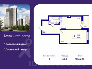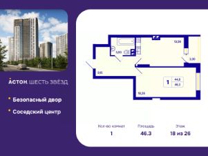 1-комн. квартира с предчистовой отделкой в ЖК "Астон. Шесть Звезд" на 18 этаже. Общая площадь: 46.3 кв.м., жилая: 18.26 кв.м., площадь просторной кухни-столовой: 13.56 кв.м. Все окна выходят на одну сторону. В квартире одна лоджия, один совмещенный санузел. Высота потолков 2.65 м.