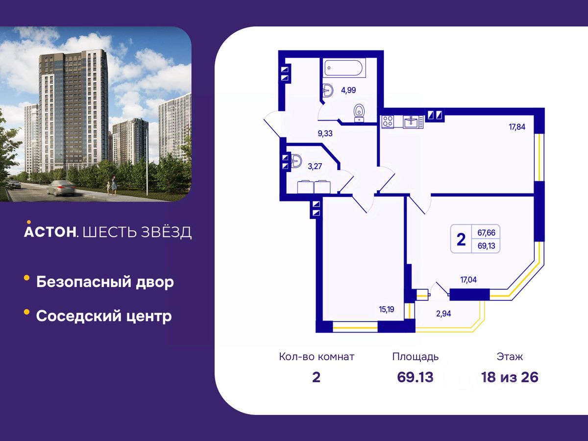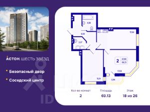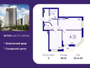 Продается 2-комн. квартира от застройщика с предчистовой отделкой в ЖК "Астон. Шесть Звезд" на 18 этаже. Общая площадь: 69.13 кв.м., жилая: 32.23 кв.м., площадь просторной кухни-столовой: 17.84 кв.м. Квартира угловая, очень светлая, естественная вентиляция при открытии окон. В квартире одна лоджия, один совмещенный и один раздельный санузел. Высота потолков 2.65 м.