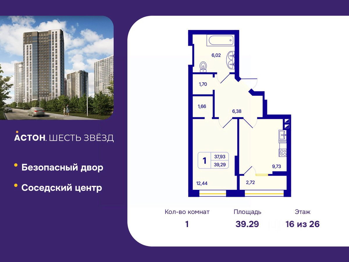 1-комн. квартира от застройщика с предчистовой отделкой в ЖК "Астон. Шесть Звезд" на 16 этаже. Общая площадь: 39.29 кв.м., жилая: 12.44 кв.м., площадь просторной кухни-столовой: 9.73 кв.м. Все окна выходят на одну сторону. В квартире одна лоджия, один совмещенный санузел. Высота потолков 2.65 м.