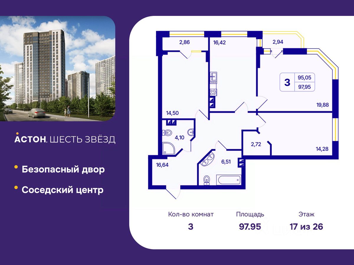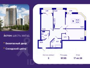 3-комн. квартира от застройщика с предчистовой отделкой в ЖК "Астон. Шесть Звезд" на 17 этаже. Общая площадь: 97.95 кв.м., жилая: 48.66 кв.м., площадь просторной кухни-столовой: 16.42 кв.м. Квартира угловая, очень светлая, естественная вентиляция при открытии окон. В квартире одна лоджия, два совмещенных санузла. Высота потолков 2.65 м.
