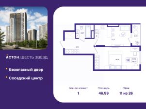 Продается 1-комн. квартира от застройщика с предчистовой отделкой в ЖК "Астон. Шесть Звезд" на 11 этаже. Общая площадь: 46.59 кв.м., жилая: 18.226 кв.м., площадь просторной кухни-столовой: 13.71 кв.м. Все окна выходят на одну сторону. В квартире одна лоджия, один совмещенный санузел. Высота потолков 2.65 м.