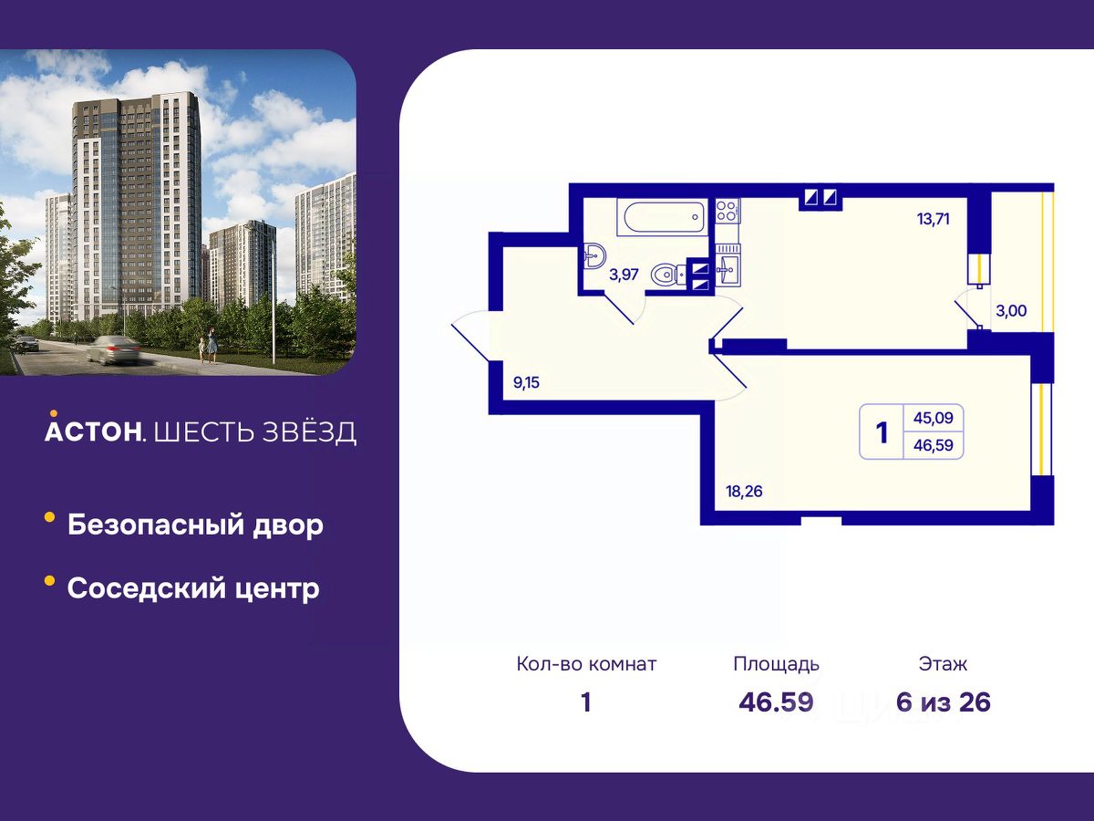 "Астон.Шесть звезд" - современный комплекс из 26-этажных домов класса "комфорт плюс" с уютными квартирами, вдохновляющими видами на левобережье, продуманной организацией жилого пространства, стильным дизайном общественных интерьеров и авторским благоустройством.