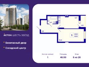 Просторная 1-комн. квартира с предчистовой отделкой в ЖК "Астон. Шесть Звезд" на 6 этаже. Общая площадь: 46.59 кв.м., жилая: 18.226 кв.м., площадь просторной кухни-столовой: 13.71 кв.м. Все окна выходят на одну сторону. В квартире одна лоджия, один совмещенный санузел. Высота потолков 2.65 м.