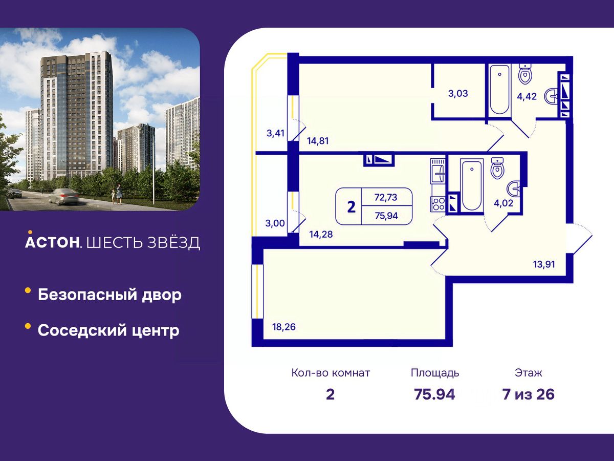 Продается 2-комн. квартира от застройщика с предчистовой отделкой в ЖК "Астон. Шесть Звезд" на 7 этаже. Общая площадь: 75.94 кв.м., жилая: 33.07 кв.м., площадь просторной кухни-столовой: 14.28 кв.м. Комнаты изолированные, все окна выходят на одну сторону. В квартире две лоджии, два совмещенных санузла. Высота потолков 2.65 м.