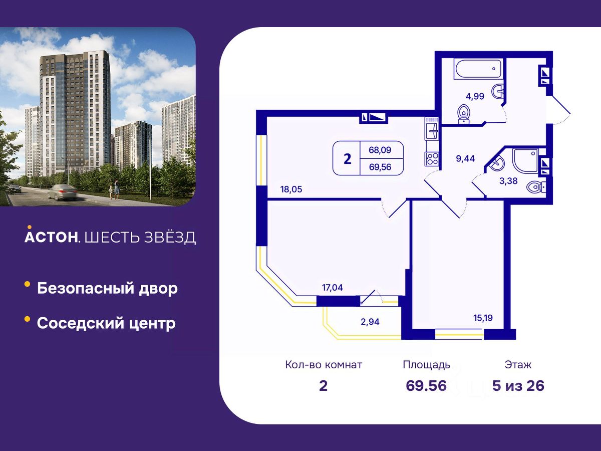 Двухкомнатная квартира с предчистовой отделкой в ЖК "Астон. Шесть Звезд" на 5 этаже. Общая площадь: 69.56 кв.м., жилая: 32.23 кв.м., площадь просторной кухни-столовой: 18.05 кв.м. Квартира угловая, очень светлая, естественная вентиляция при открытии окон. В квартире одна лоджия, два совмещенных санузла. Высота потолков 2.65 м.