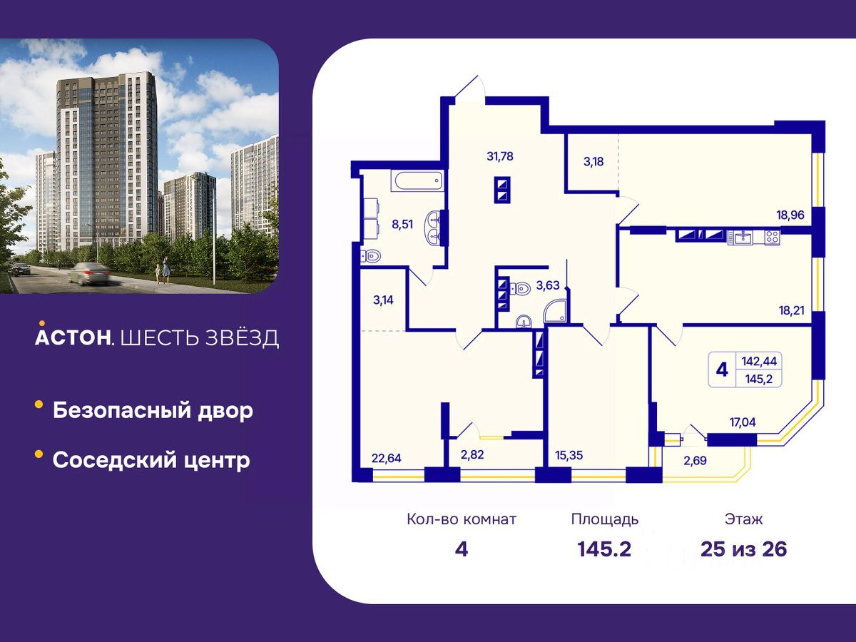 Просторная 4-комн. квартира с предчистовой отделкой в ЖК "Астон. Шесть Звезд" на 25 этаже. Общая площадь: 145.2 кв.м., жилая: 73.99 кв.м., площадь просторной кухни-столовой: 18.21 кв.м. Угловая квартира, очень светлая, естественная вентиляция при открытии окон. В квартире одна лоджия, два совмещенных санузла. Высота потолков 2.65 м.