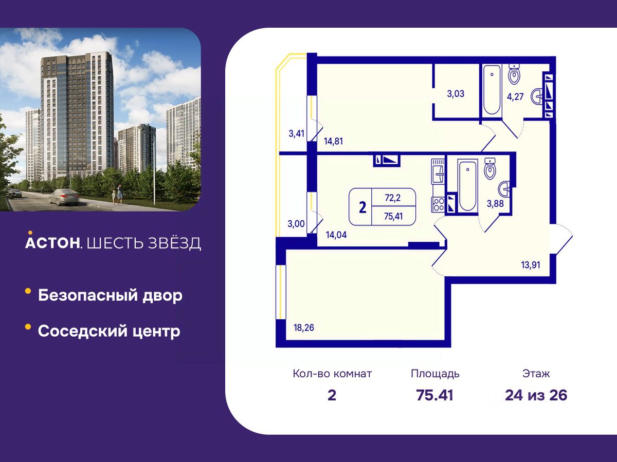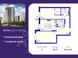 Продается 2-комн. квартира от застройщика с предчистовой отделкой в ЖК "Астон. Шесть Звезд" на 24 этаже. Общая площадь: 75.41 кв.м., жилая: 33.07 кв.м., площадь просторной кухни-столовой: 14.04 кв.м. Комнаты изолированные, все окна выходят на одну сторону. В квартире две лоджии, два совмещенных санузла. Высота потолков 2.65 м.
