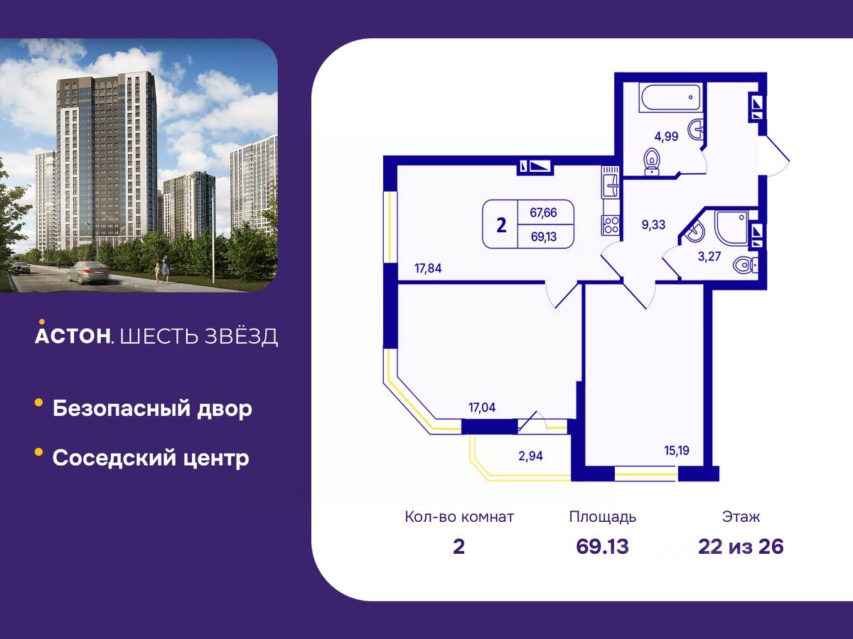 Двухкомнатная квартира с предчистовой отделкой в ЖК "Астон. Шесть Звезд" на 22 этаже. Общая площадь: 69.13 кв.м., жилая: 32.23 кв.м., площадь просторной кухни-столовой: 17.84 кв.м. Квартира угловая, идеально подойдет любителям тишины и панорамных видов. В квартире одна лоджия, один совмещенный и один раздельный санузел. Высота потолков 2.65 м.