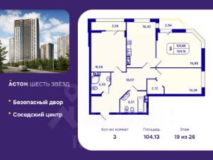 Трехкомнатная квартира с предчистовой отделкой в ЖК "Астон. Шесть Звезд" на 19 этаже. Общая площадь: 104.13 кв.м., жилая: 52.24 кв.м., площадь просторной кухни-столовой: 16.42 кв.м. Угловая квартира, идеально подойдет любителям тишины и панорамных видов. В квартире две лоджии, два совмещенных санузла. Высота потолков 2.65 м.