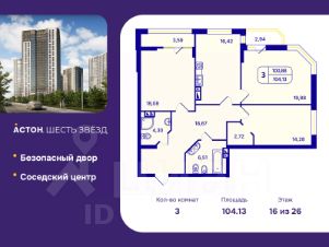Просторная 3-комн. квартира с предчистовой отделкой в ЖК "Астон. Шесть Звезд" на 16 этаже. Общая площадь: 104.13 кв.м., жилая: 52.24 кв.м., площадь просторной кухни-столовой: 16.42 кв.м. Квартира угловая, окна oбecпeчивaют paвнoмepнoe ocвeщeниe в тeчeниe дня. В квартире две лоджии, два совмещенных санузла. Высота потолков 2.65 м.