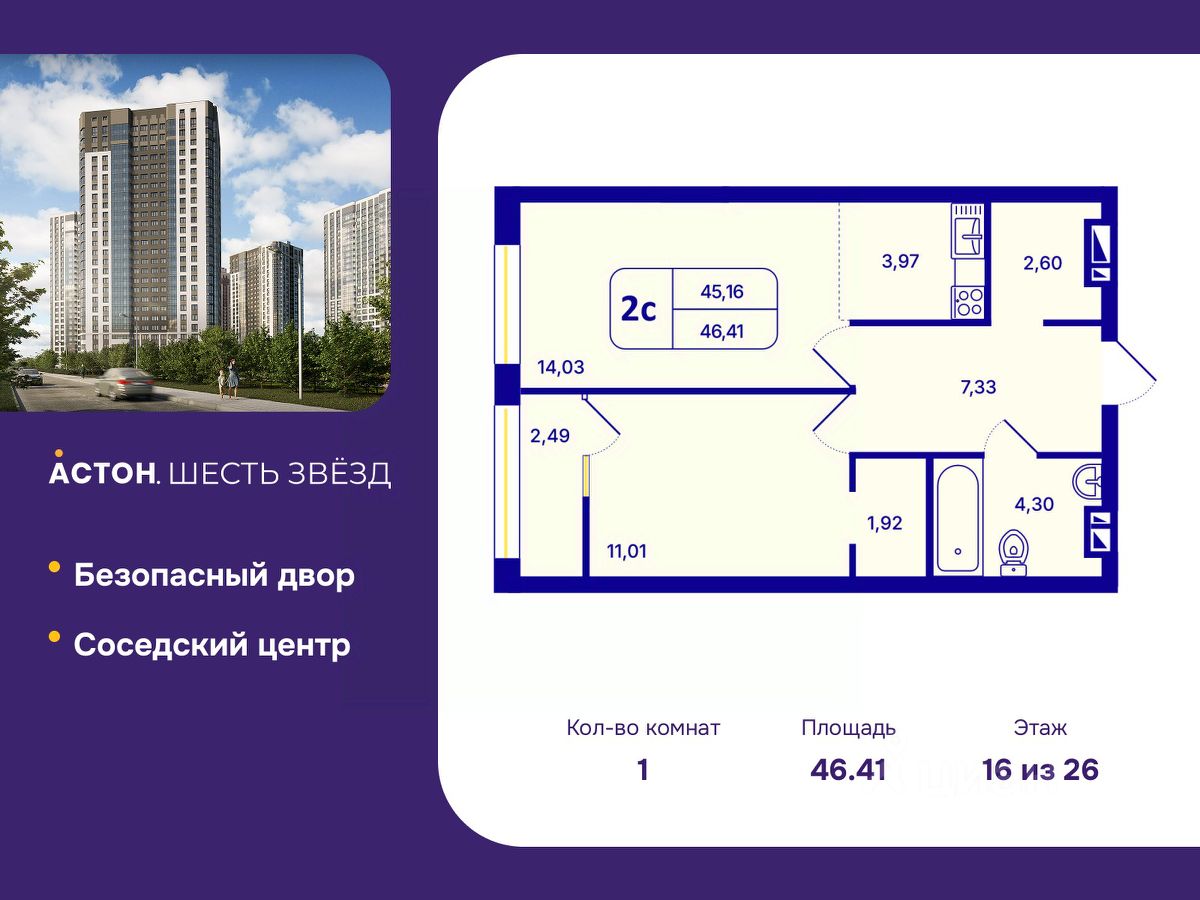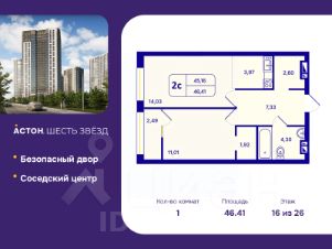 1-комн. квартира с предчистовой отделкой в ЖК "Астон. Шесть Звезд" на 16 этаже. Общая площадь: 46.41 кв.м., жилая: 11.01 кв.м., площадь просторной кухни-столовой: 18 кв.м. Все окна выходят на одну сторону. В квартире одна лоджия, один совмещенный санузел. Высота потолков 2.65 м.