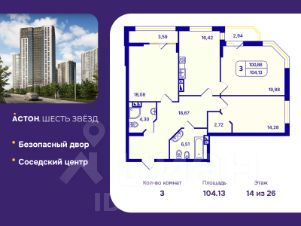 3-комн. квартира с предчистовой отделкой в ЖК "Астон. Шесть Звезд" на 14 этаже. Общая площадь: 104.13 кв.м., жилая: 52.24 кв.м., площадь просторной кухни-столовой: 16.42 кв.м. Угловая квартира, идеально подойдет любителям тишины и панорамных видов. В квартире две лоджии, два совмещенных санузла. Высота потолков 2.65 м.
