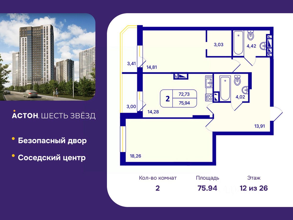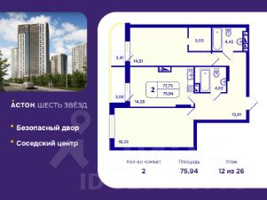 Двухкомнатная квартира с предчистовой отделкой в ЖК "Астон. Шесть Звезд" на 12 этаже. Общая площадь: 75.94 кв.м., жилая: 33.07 кв.м., площадь просторной кухни-столовой: 14.28 кв.м. Комнаты изолированные, все окна выходят на одну сторону. В квартире две лоджии, два совмещенных санузла. Высота потолков 2.65 м.
